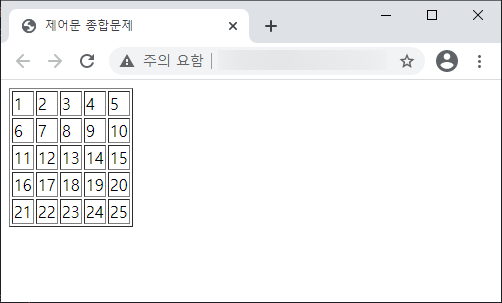 | 5ํ 5์ด ํ๋ฅผ ๋ง๋ค๊ณ , ๋ฐ์ดํฐ๊ฐ 1๋ถํฐ 25๊น์ง ์ถ๋ ฅ๋๋๋ก ์์ฑํ์์ค. |