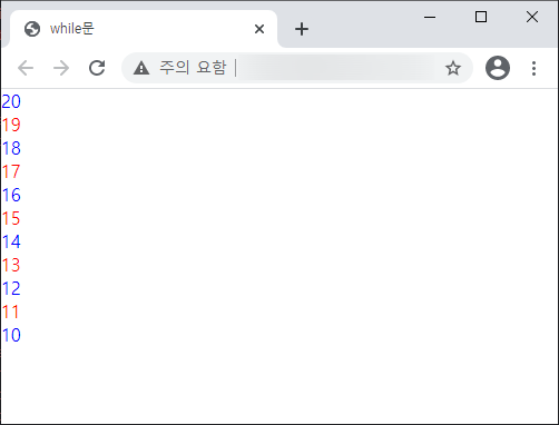 ์์ 3) 20๋ถํฐ 10๊น์ง์ ์ซ์ ์ค ์ง์์ผ ๊ฒฝ์ฐ์๋ ํ๋์, ํ์์ผ ๊ฒฝ์ฐ์๋ ๋นจ๊ฐ์์ผ๋ก ์ถ๋ ฅ๋๋๋ก ํ๊ธฐ