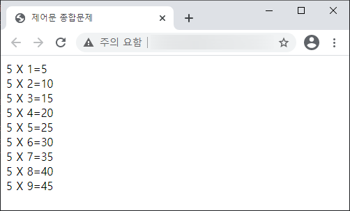 document.write("5 X " + i + "=" + i * 5, "<br>");