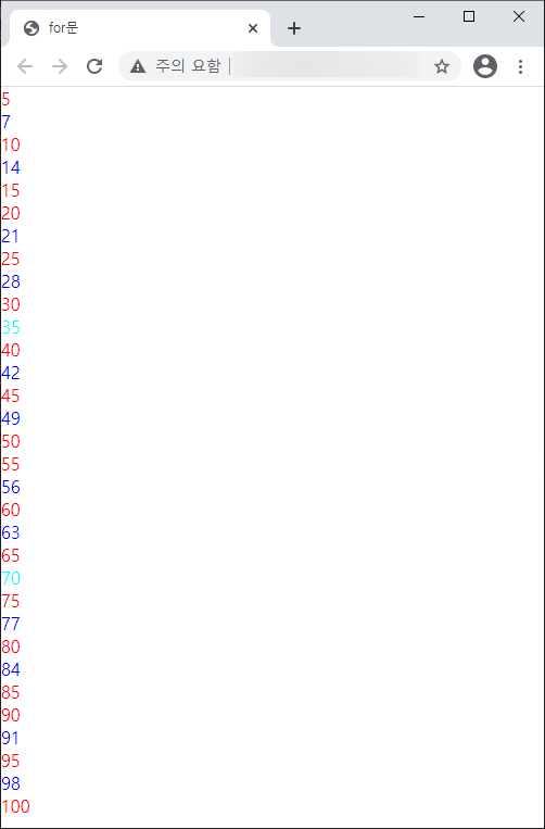 ์์ 2) 1๋ถํฐ 100๊น์ง 5์ ๋ฐฐ์์ผ ๊ฒฝ์ฐ์๋ ๋นจ๊ฐ์ ๊ธ์, 7์ ๋ฐฐ์์ผ ๊ฒฝ์ฐ์๋ ์ด๋ก์ ๊ธ์, ๊ทธ๋ฆฌ๊ณ 5์ ๋ฐฐ์์ด๋ฉฐ 7์ ๋ฐฐ์์ผ ๊ฒฝ์ฐ์๋ ์์ฟ ์์ ๊ธ์๋ก ์ถ๋ ฅํ๊ธฐ