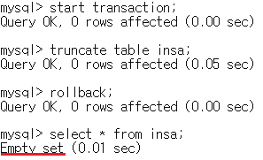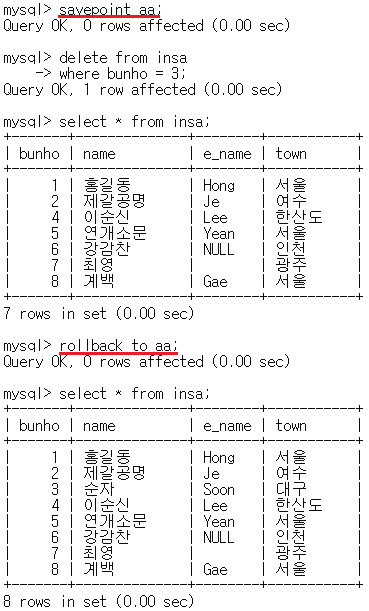 -rollback to aa ๋ช ๋ น์ด๋ฅผ ์ฌ์ฉํ๋ ค๋ฉด autocommit=0 ์ด์ด์ผํจ.