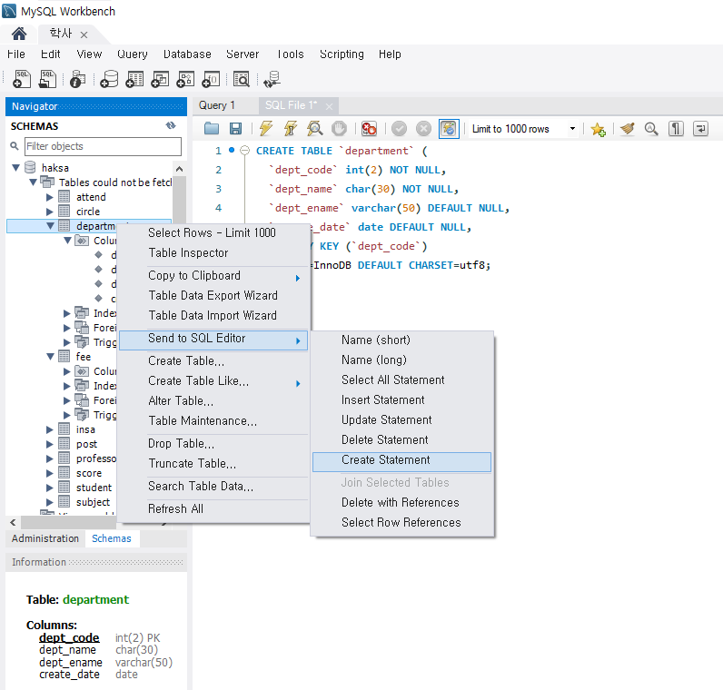 ('haksa' ๋ฐ์ดํฐ๋ฒ ์ด์ค๋ ์ ์ฒด 9๊ฐ์ ํ ์ด๋ธ๋ก ๊ตฌ์ฑ๋์ด ์๊ณ , ํ ์ด๋ธ์ ์์ฑํ๊ธฐ ์ํด์ create table ๋ช ๋ น๋ฌธ์ ์ ๋ ฅํ๋ค.)