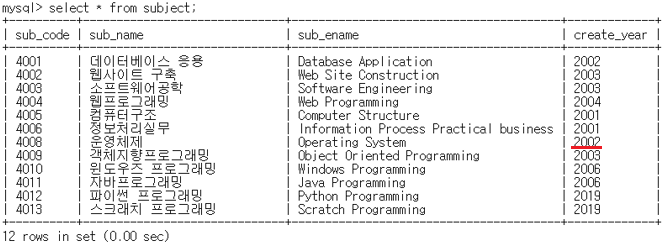 mysql> update subject set create_year = '2002' where sub_name = '์ด์์ฒด์ ';