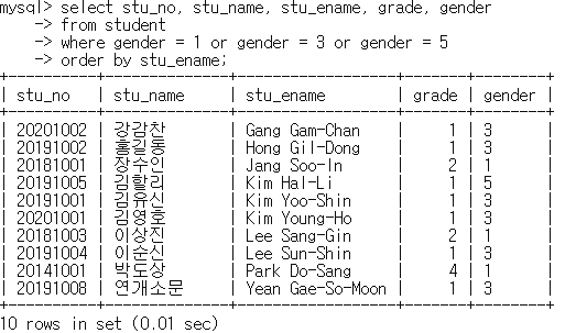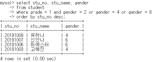mysql> select stu_no, stu_name, gender from student where grade = 1 and gender = 2 or gender = 4 or gender = 6 order by stu_no desc;