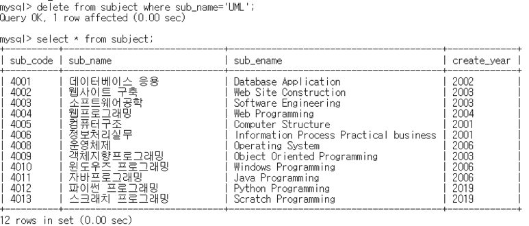 ์์ 4-6) ๊ณผ๋ชฉ๋ช (sub_name)์ด UML์ธ ๊ณผ๋ชฉ์ ์ญ์ ํ๋ผ.
