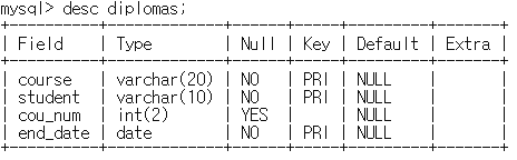 mysql> insert into diplomas values('์นํ๋ก๊ทธ๋๋ฐ', '๊ณต์', 2, '2007/07/25');