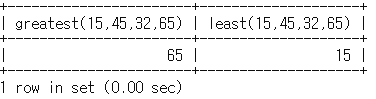 mysql> select greatest(15,45,32,65), least(15,45,32,65);