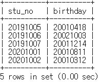 mysql> select stu_no, birthday from student where substring(birthday, 1, 4) > 2000;
