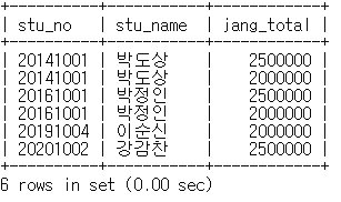 mysql> select distinct s.stu_no, stu_name, jang_total