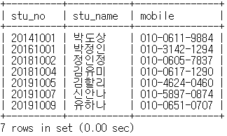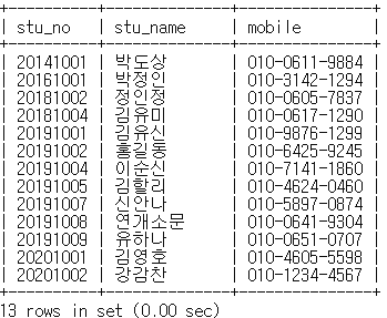 mysql> select stu_no, stu_name, mobile, post_no from student;