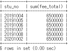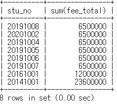 mysql> select stu_no, sum(fee_total)