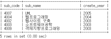 mysql> select sub_code, sub_name, create_year