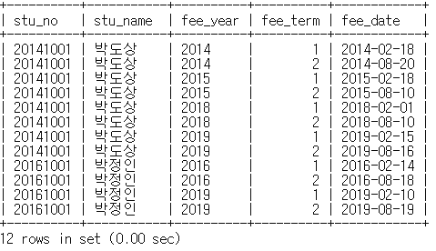 mysql> select f.stu_no, stu_name, fee_year, fee_term, fee_date