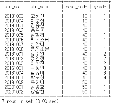 -> order by dept_code, grade, stu_no;