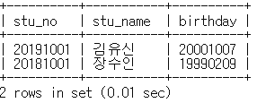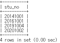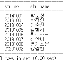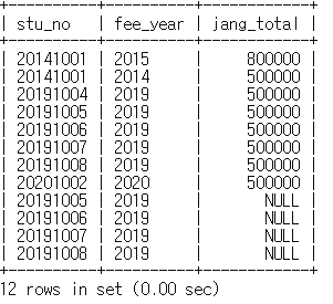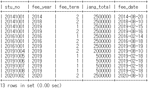 mysql> select stu_no, fee_year, fee_term, jang_total, fee_date