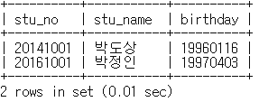 mysql> select stu_no, stu_name, birthday