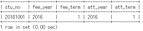 mysql> select distinct f.stu_no, fee_year, fee_term, att_year, att_term