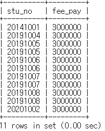 mysql> select stu_no, fee_pay