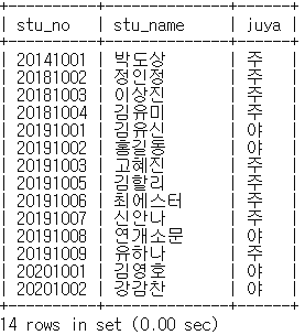 mysql> select stu_no, stu_name, juya