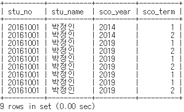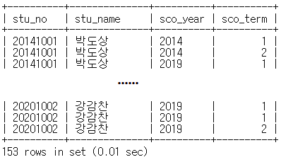 mysql> select s.stu_no, stu_name, sco_year, sco_term