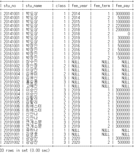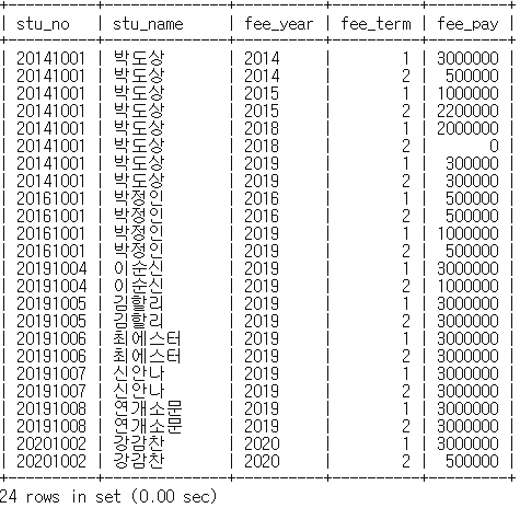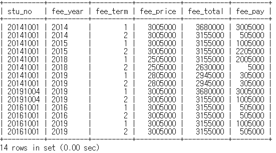 mysql> select stu_no, fee_year, fee_term, fee_price, fee_total, fee_pay