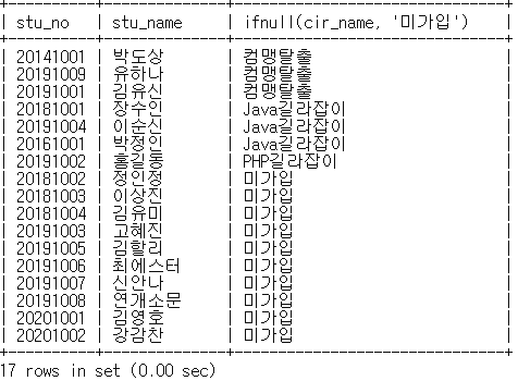 mysql> select s.stu_no, s.stu_name, ifnull(cir_name, 'λ―Έκ°μ ')