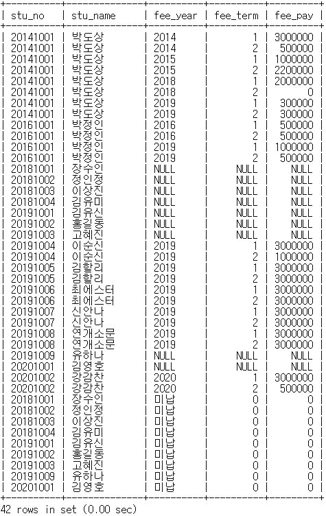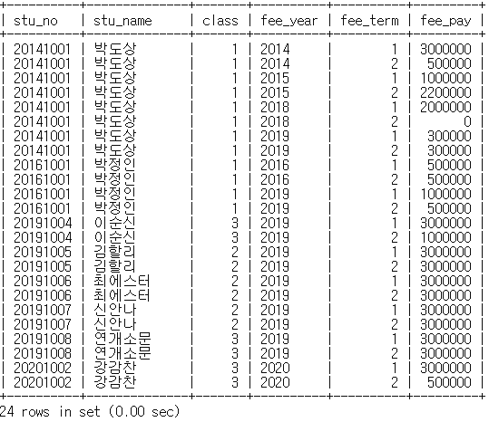 mysql> select student.stu_no, stu_name, fee_year, fee_term, fee_pay