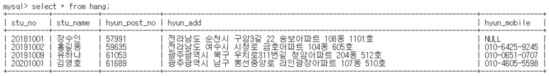 -> (stu_no, stu_name, hyun_post_no, hyun_add, hyun_mobile)
