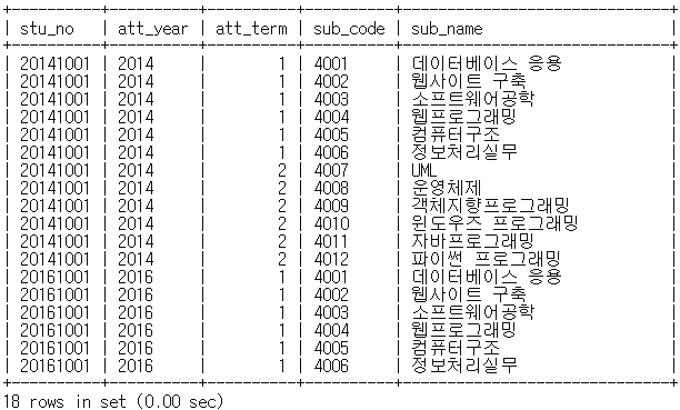 mysql> select s.stu_no, stu_name, att_year, att_term, a.sub_code, sub_name κ³Όλͺ©λͺ ,