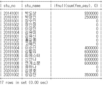 mysql> select s.stu_no, stu_name, ifnull(sum(fee_pay), 0)