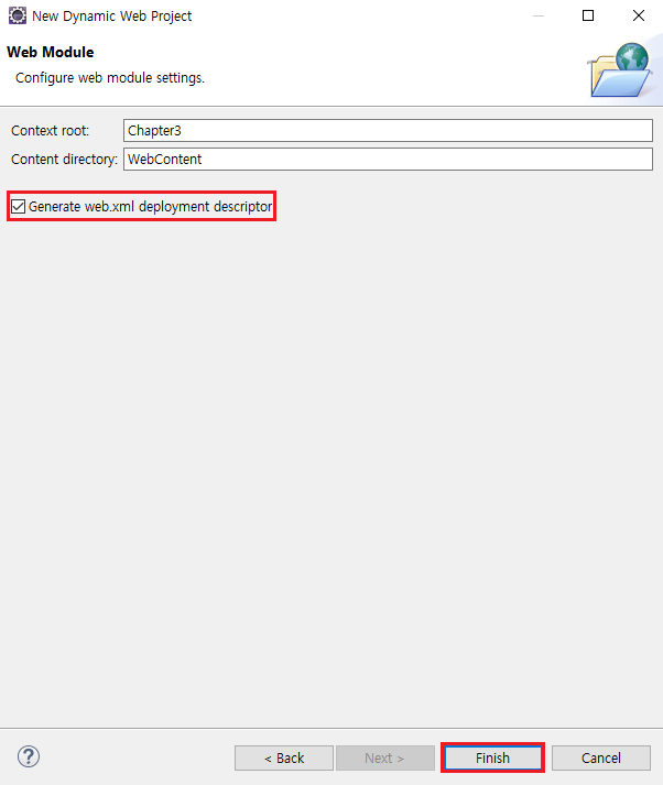 4. ์ฒดํฌ๋ฐ์ค๋ฅผ ์ฒดํฌํ ํ <Finish>๋ฅผ ๋๋ฅธ๋ค. ์ดํด๋ฆฝ์ค์์ web.xml ํ์ผ์ด ํ๋ก์ ํธ์ ์๋ ์์ฑ๋๊ฒ ํ๋ ค๋ฉด ์ฒดํฌ ๋ฐ์ค๋ฅผ ์ฒดํฌํ์ฌ์ผ ํ๋ค.