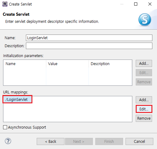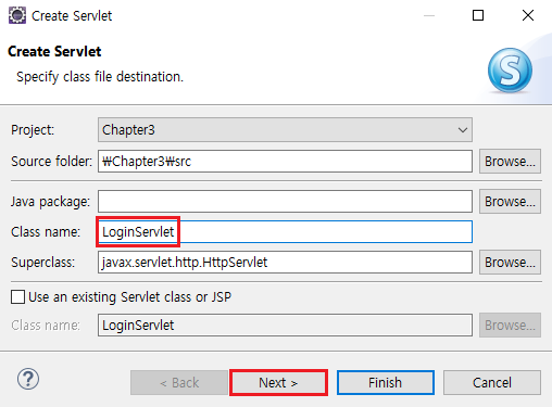 2. Class name์ "LoginServlet"์ ์ ๊ณ <Next>๋ฅผ ๋๋ฅธ๋ค. ์ด ๋ถ๋ถ์ ์ค์ง์ ์ผ๋ก ์์ฑ๋๋ ์๋ฐ ํ์ผ๋ช ์ ์ง์ ํ๋ ๋ถ๋ถ์ผ๋ก web.xml ์ค์ ์์ <servlet-class> ํญ๋ชฉ์ ์ค์ ๋๋ ๊ฐ์ด๋ค.