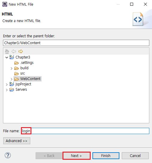 2. File name์ "login"์ ์ ๋ ฅํ๊ณ <Next>๋ฅผ ๋๋ฅธ๋ค.
