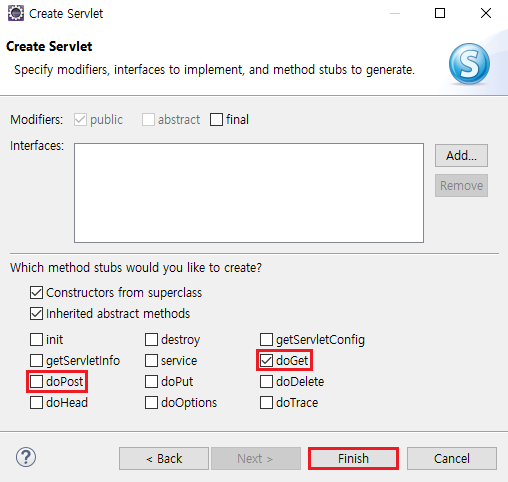 4. ๋ณธ ์์ ์ ์์ฒญ ๋ฐฉ์์ด GET ๋ฐฉ์์ด๋ฏ๋ก "Which method stubs would you like to create?" ๋ถ๋ถ์ ์ฒดํฌ ๋ฐ์ค์์ doGet ๋ฉ์๋๋ง ์ฒดํฌํ ํ <Finish>๋ฅผ ํด๋ฆญํ๋ค.