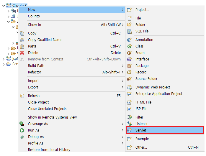 1. New→Servlet์ ํด๋ฆญํ๋ค.
