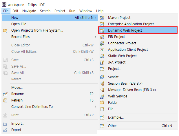 1. New→Dynamic Web Project๋ก ๋ค์ด๊ฐ๋ค.