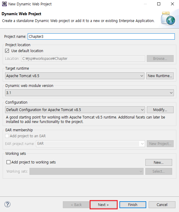 2. Project name์ "Chapter3" ์ด๋ผ๊ณ ์ ๋ ฅ ํ <Next>๋ฅผ ๋๋ฅธ๋ค.