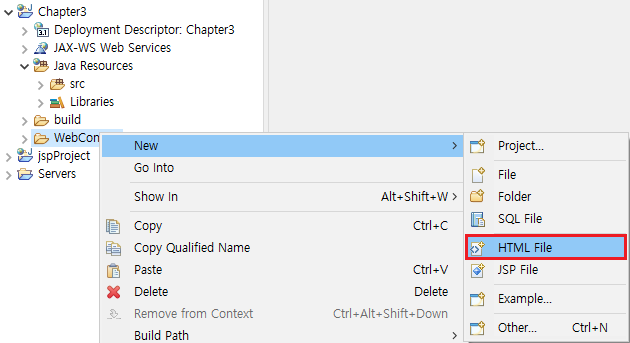 1. Chapter3์ WebContent์ ๋ง์ฐ์ค ์ค๋ฅธ์ชฝ ๋ฒํผ์ ํด๋ฆญํ๊ณ HTML File์ ์์ฑํ๋ค.