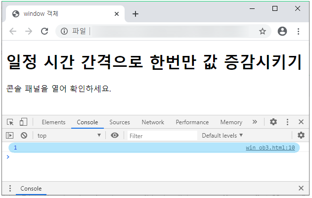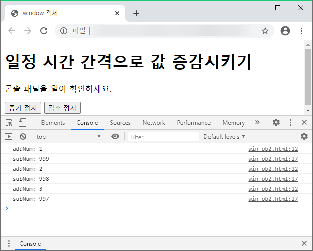 ์ผ์ ํ ์๊ฐ ๊ฐ๊ฒฉ์ผ๋ก ์ฝ๋๋ฅผ ์คํํ๋ ๋ฉ์๋๋ก๋ setInterval() ๊ณผ setTimeout() ๊ฐ ์๋ค. setInterval()์ ์ผ์ ํ ์๊ฐ ๊ฐ๊ฒฉ์ผ๋ก ์ฝ๋๋ฅผ ๋ฐ๋ณต ์คํํ๋ค. setTimeout()์ ์ผ์ ํ ์๊ฐ ํ์ ์ฝ๋๋ฅผ ์คํํ๊ณ ์ข ๋ฃํ๋ค. clearInterval() ๋ฉ์๋๋ setInterval() ๋ฉ์๋๋ฅผ ์ทจ์ํ๋ค.