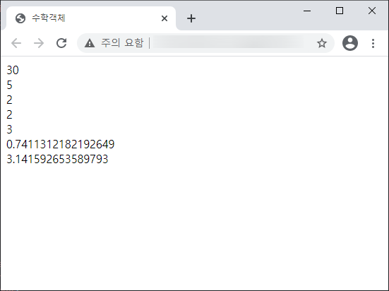 ์๋ฐ์คํฌ๋ฆฝํธ ๋ด์ฅ ๊ฐ์ฒด์๋ ์ํ๊ณผ ๊ด๋ จ๋ ๊ธฐ๋ฅ๊ณผ ์์ฑ์ ์ ๊ณตํ๋ ์ํ ๊ฐ์ฒด๊ฐ ์๋ค. ๋ํ๊ธฐ, ๊ณฑํ๊ธฐ, ๋๋๊ธฐ ๋ฑ์ ์์์ ๋ฐฐ์ด ์ฐ์ ์ฐ์ฐ์๋ฅผ ์ฌ์ฉํ๋ฉด ๋๋ค. ํ์ง๋ง ์ต๋๊ฐ, ์ต์๊ฐ, ๋ฐ์ฌ๋ฆผ๊ฐ ๋ฑ์ ์ฐ์ ์ฐ์ฐ์๋ก ๊ตฌํ ์ ์๋ค. ํ์ง๋ง ๋ฉ์๋๋ฅผ ์ฌ์ฉํ๋ฉด ๊ฐ์ ์ฒ๋ฆฌํ ์ ์๋ค.