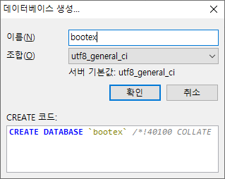 2. ๋ฐ์ดํฐ๋ฒ ์ด์ค ์ด๋ฆ์ 'bootex'๋ผ๊ณ ์ ํ๊ณ ํ์ธ ํด๋ฆญ.