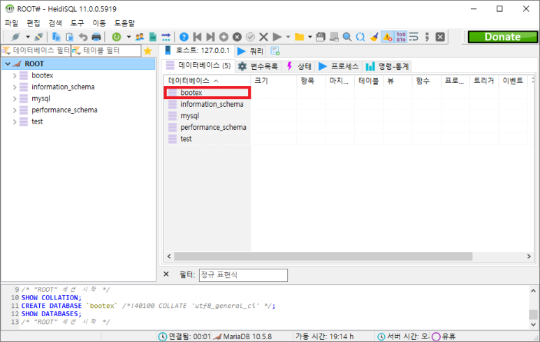 3. ์์ฑํ๋ฉด ๋ฐ์ดํฐ๋ฒ ์ด์ค ๋ชฉ๋ก์ 'bootex'๊ฐ ๋ณด์ด๋ ๊ฒ์ ํ์ธํ ์ ์๋ค.
