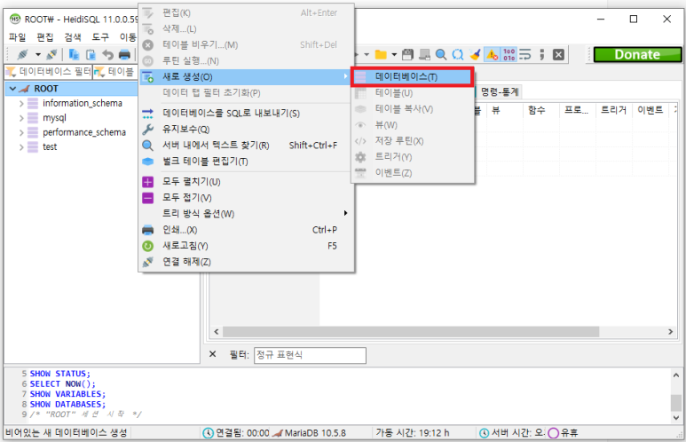 1. MariaDB์ ์ ์ํด์ ์ค๋ฅธ์ชฝ ๋ง์ฐ์ค ํด๋ฆญ → ์๋ก ์์ฑ → ๋ฐ์ดํฐ๋ฒ ์ด์ค ํด๋ฆญ.