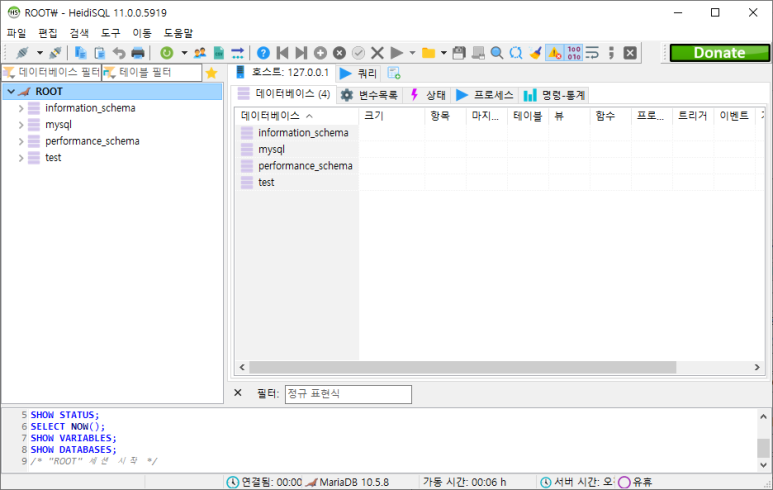 7. ์ ์์ ์ผ๋ก ์คํ๋๋ค๋ฉด ์๋์ ๊ฐ์ด ํ์ฌ ๋ฐ์ดํฐ๋ฒ ์ด์ค์ ์ ๋ณด๋ฅผ ํ์ธํ ์ ์๋ค.
