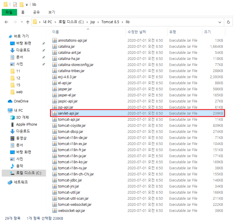 10. C:\jsp\Tomcat 8.5\libλ‘ κ°μ servlet-api.jar νμΌμ 볡μ¬νλ€.