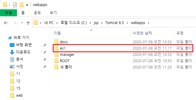 12. μμΌλ‘ νμΌμ λ§λ€λ©΄ C:\jsp\Tomcat 8.5\webapps ← κ²½λ‘μ μ μ₯ν΄μΌ νλ€.