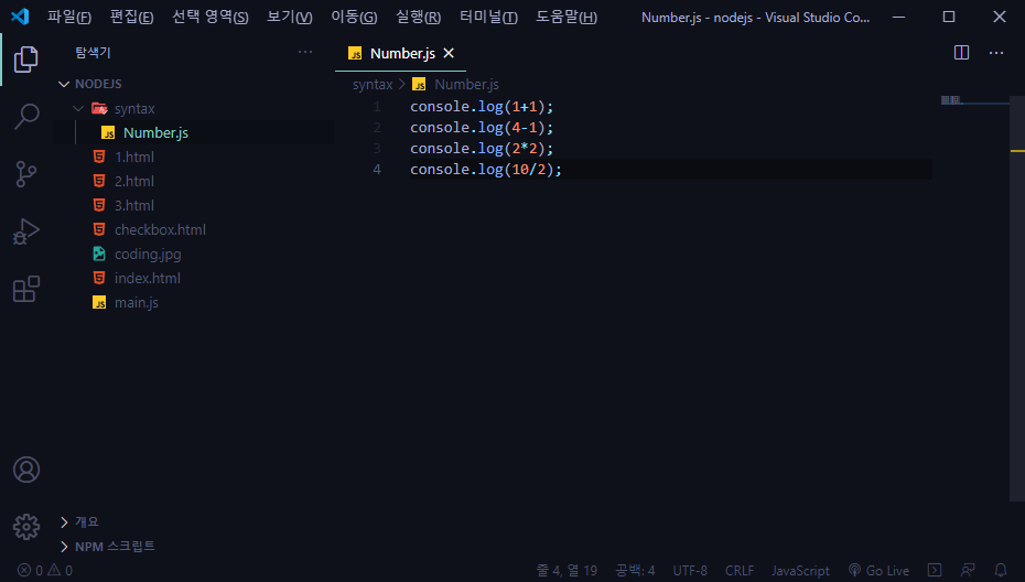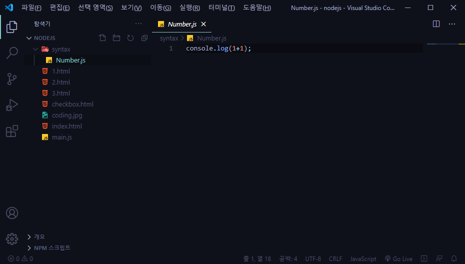 1. syntax ๋ผ๋ ํด๋๋ฅผ ์์ฑํ๊ณ ๊ทธ ์์ Number.js ๋ผ๋ js ํ์ผ์ ๋ง๋ ๋ค.