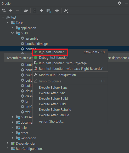1. build νλͺ© λ΄λΆμ 'bootjar' μ μ ννκ³ μ€ννλ€.