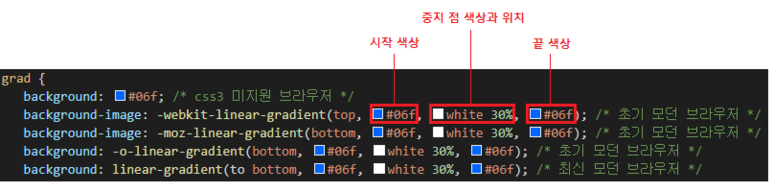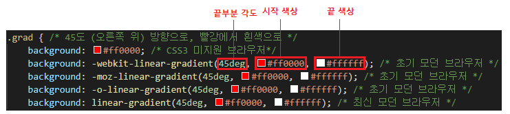 ๊ธฐ๋ณธํ) linear-gradient( <๊ฐ๋> to <๋ฐฉํฅ>, color-stop, [color-stop, ..] );