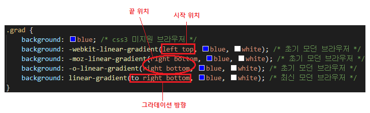 to top(์๋์์ ์์ํด ์๋ก ๊ทธ๋ผ๋ฐ์ด์ ) to left(์ค๋ฅธ์ชฝ์ผ๋ก ์์ํด ์ผ์ชฝ์ผ๋ก ๊ทธ๋ผ๋ฐ์ด์ ) to right(์ผ์ชฝ์์ ์์ํด ์ค๋ฅธ์ชฝ์ผ๋ก ๊ทธ๋ผ๋ฐ์ด์ ) to bottom(์์์ ์์ํด ์๋๋ก ๊ทธ๋ผ๋ฐ์ด์ |